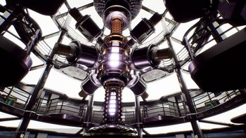 The fusion reactor is located at the very centre of the Reactor Room, stretching from G to D Deck. It is connected to inflow pipes connected to the Cryogenic Storage facilities, requiring input of Helium, Helium3 and Deuterium as coolant and fuel, respectively. The fusion reactor is controlled through the Fusion Reactor control panel, which manages it startup/shutdown process and power flow. Power produced from the reactor is sent to the distributors located around the reactor room.