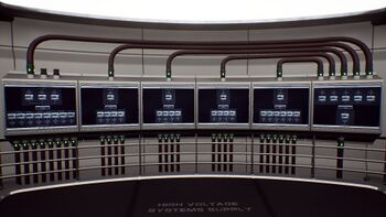 The six main distribution panels are located on the starboard wall of G Deck. They are used divert the electrical output of the reactor to ships systems, including the main battery arrays, FTL systems, shields, ship weaponry and sub-light engines. The main reactor output distributor panel is located on the far-right side of the group, which diverts power directly from the fusion reactor to the other panels and their systems. Upon the reactor's activation, the main panel will come online, whilst the others will need to have power diverted to them to begin their operations.